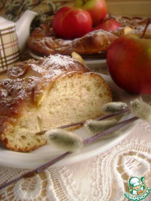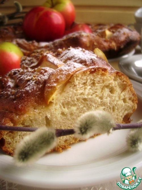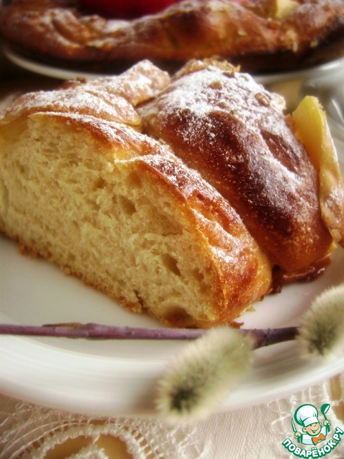 Готовое тесто разделить на три части, подкатать в ровные колбаски и переплести их косой. Замкнуть венком и переложить в смазанную форму. Между витков косы вставить ломтики яблок – я положила с кожурой. Смазать сверху желтком с молоком, посыпать немного кристаллами коричневого сахара и геркулесом.