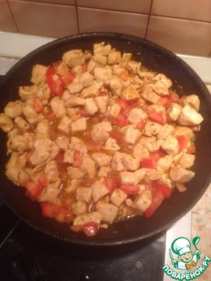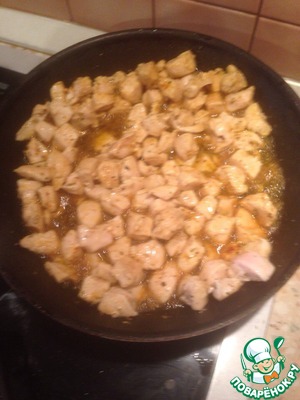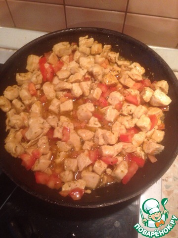 После того как выложили чеснок, добавляем порезанную кубиками курочку, обжариваем ее до белого цвета, далее солим, перчим и добавляем специи, у меня паприка, карри, орегано, перемешиваем, тушим под крышкой.
