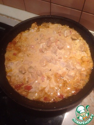 После того как помидорка протушилась, заливаем все сливками, и тушим под крышкой 5 минут