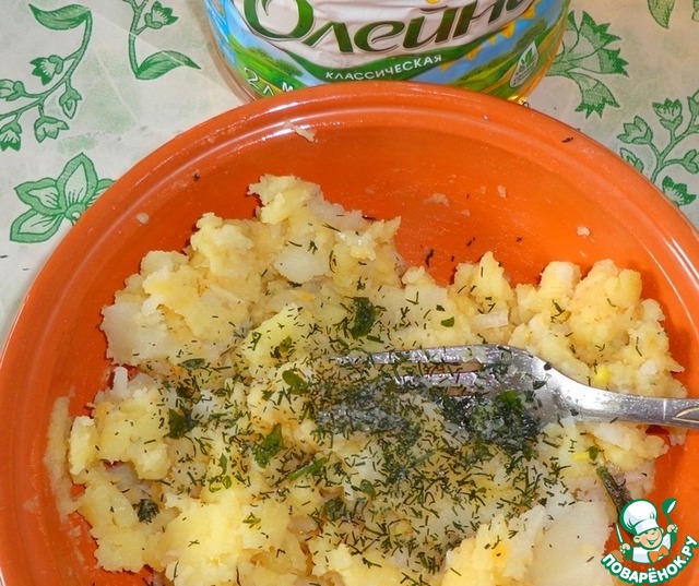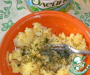 Отварной картофель необходимо размять, посолить и добавить укроп или другую зелень.