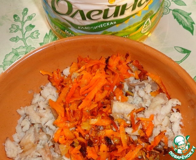 Морковь потереть на крупной терке и обжарить с измельченным репчатым луком. Добавить морковь с луком к филе и перемешать.