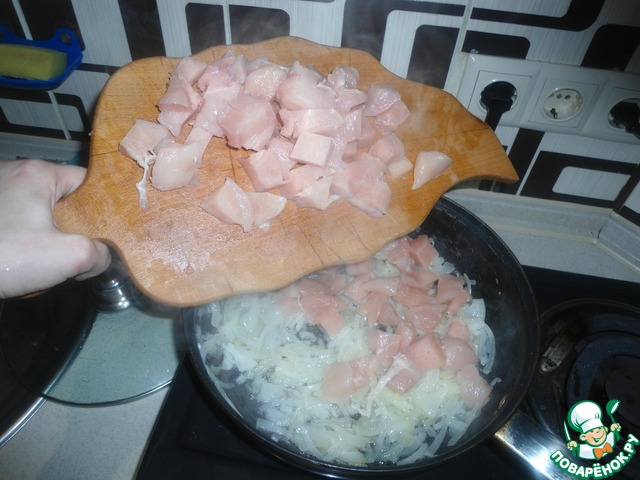 Через пять мин. добавляем порезанную кубиками куриную грудку. Жарим на среднем огне 15 мин.