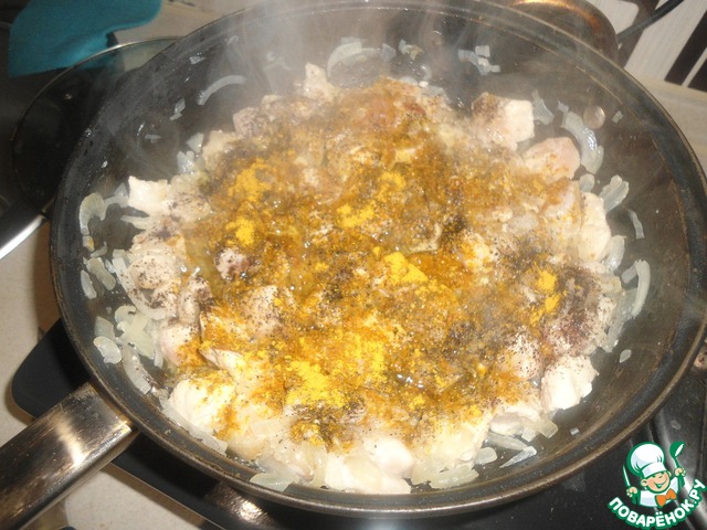 Добавляем соль, перец и карри. Я в ингредиентах написала примерные пропорции. Но думаю это дело вкуса каждого. Жарим еще 5 мин.