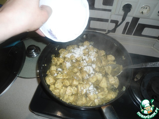 Посыпаем курочку столовой ложкой с горкой муки и перемешиваем, жарим еще 3 мин.