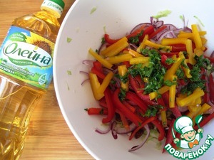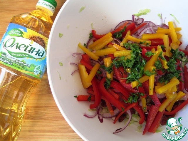 Перец нарежем тонкими полосками, петрушку порубим и добавим в салат.