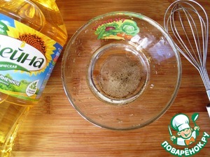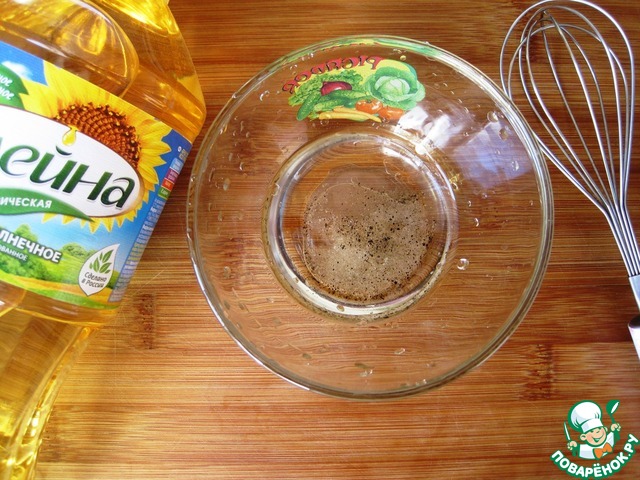 Для заправки: смешаем подсолнечное масло ТМ Олейна, яблочный уксус, сахар и чёрный молотый перец.