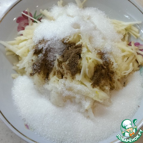 3 яблока очистите от кожицы и натрите на терке. Добавьте к яблокам сок половины лимона, корицу и полстакана сахара. Хорошенько перемешайте.