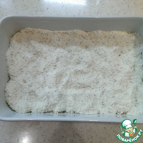 Выложите поверх пирога и отправьте в разогретую до 180 градусов духовку. У меня на выпечку ушло около часа, Вы ориентируйтесь по своей духовке. Верх пирога должен быть немного крупинчатым и сухим. От себя еще добавлю, что лучше выпекать в форме с невысокими бортами, так он быстрее пропечется и будет немного посуше.