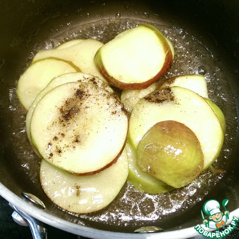 На растительном масле быстро обжарьте нарезанное кружочками яблоко, добавив пару ложек сахара и щепотку корицы.