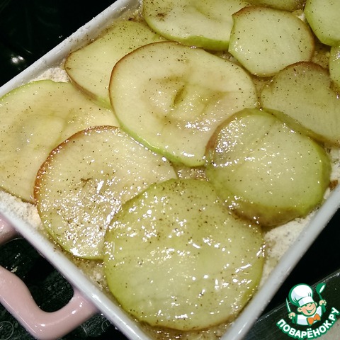 Потом поверх выложите яблочно-коричную массу. Следом еще слой сыпучей смеси и яблок. В середину высыпаем бОльшую часть сухой смеси (!). Последний слой из сыпучей смеси должен быть самым тоненьким.