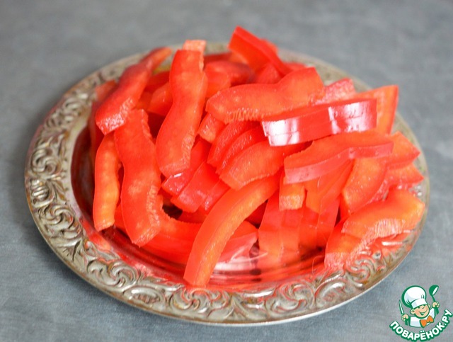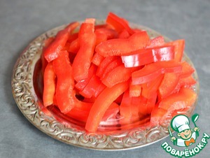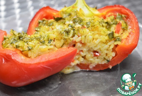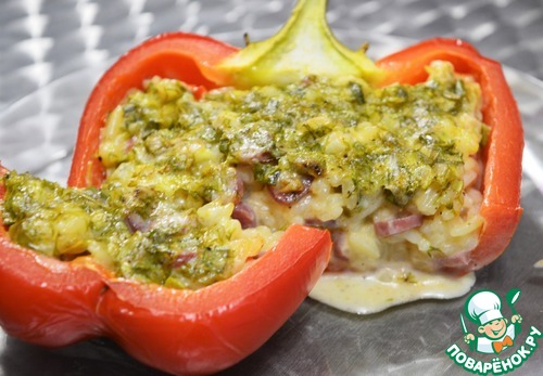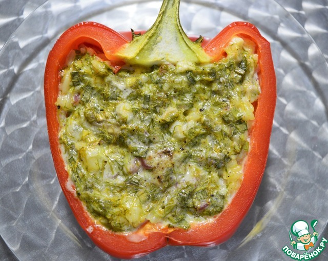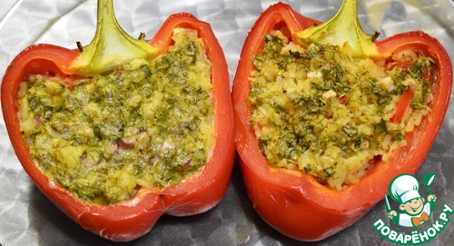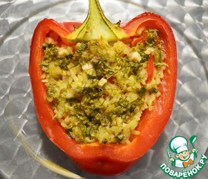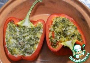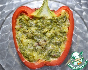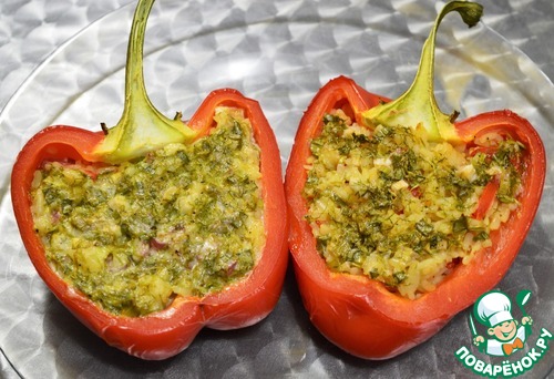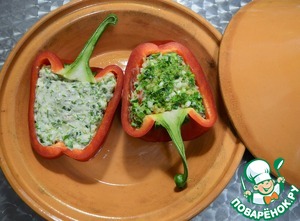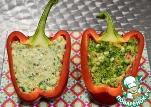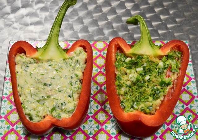 Перец разрезаем на две половинки. Заполняем разными начинками.