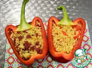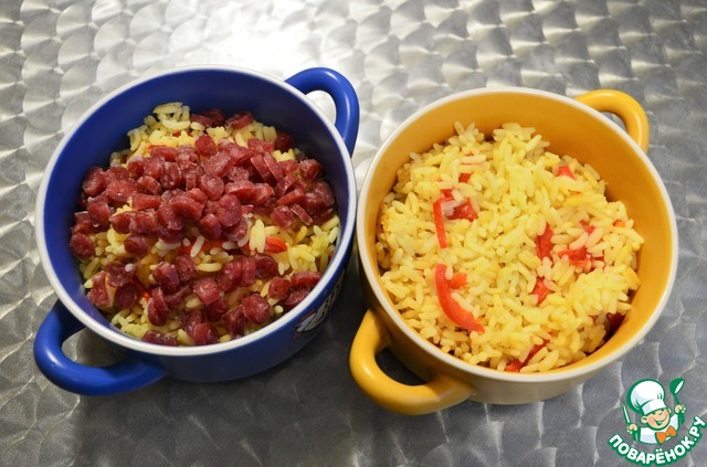 Рис смешиваем с перцем, делим на две части. В одну часть добавляем колбаски, перемешиваем.