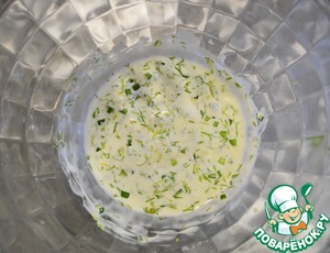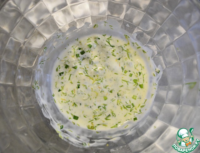 Готовим заправку. Постный майонез смешиваем с зеленью. Обычный майонез смешиваем с зеленью и сыром.