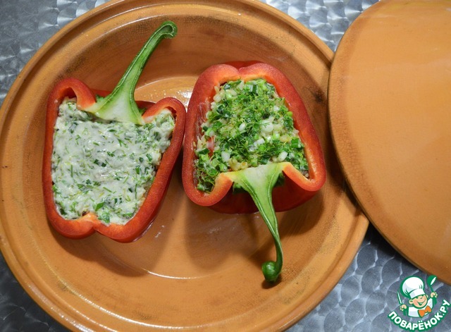 Такие перцы я раньше запекала в форме, прикрыв сверху фольгой. Но теперь у меня есть тажин, грех им не воспользоваться. Складываем перцы, закрываем крышкой и запекаем в духовке при температуре 200 градусов 25-30 минут.