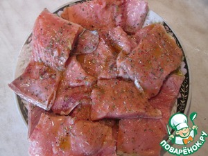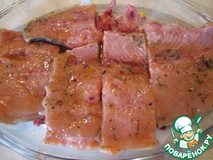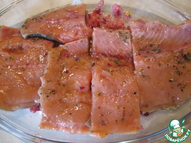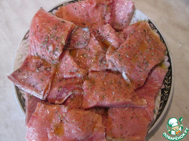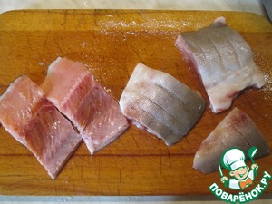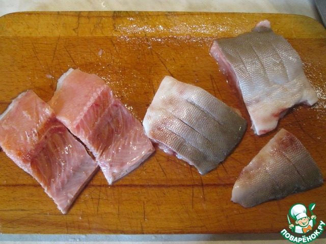 • Филе рыбы ( у меня горбуша ) порезать на кусочки по 3-4 см., сделать на шкурке неглубокие надрезы.