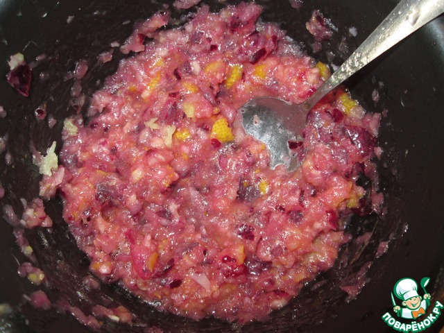 • Приготовить соус. Лук, лимон и перец чили прокрутить на мясорубке или измельчить в блендере, чеснок пропустить через пресс, добавить еще немного лимонного сока, оливкового масла, посолить.