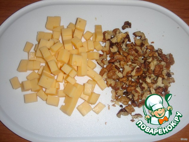Сыр порезать мелкими кубиками, орехи слегка порубить, но не в крошку.