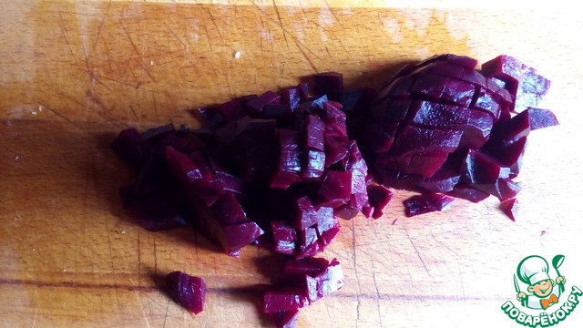 Если подготовить свеклу заранее, то салат можно приготовить за считанные минуты. Итак, свеклу отвариваем или запекаем заранее, режем кубиками со стороной примерно 1 см.