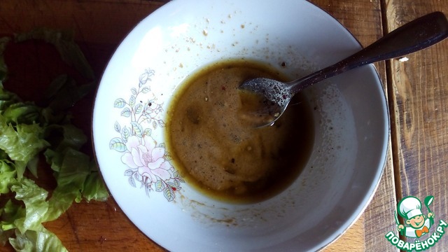 В мисочке смешиваем ингредиенты для заправки: оливковое масло, уксус, лимонный сок, солим и перчим по вкусу.