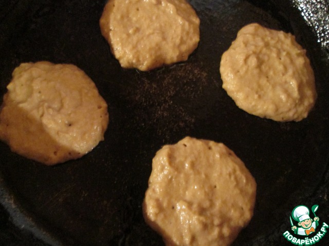 Соединить сухие и жидкие ингредиенты и хорошо перемешать. Тесто должно быть по консистенции как густая сметана. Если необходимо добавить воды. Тесто оставить на 20 минут.