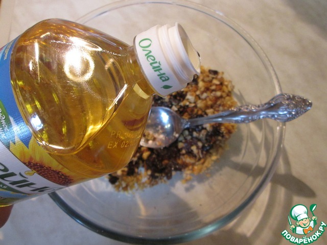 Смешать орехи и чернослив, добавить немного растительного масла и майонеза, приблизительно по одной столовой ложке. Я использовала постный майонез " Махеев ". Если вы готовите не постный вариант, то можно добавить сливочное масло и майонез, который вы обычно используете.