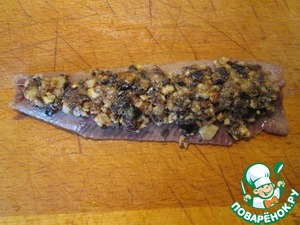 Теперь берем филе и тонким слоем распределяем начинку.