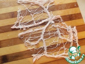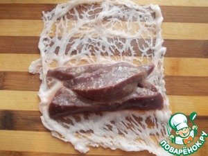 Утречком, перед тем как ехать на природу, если вы дома, то еще легче. Мы достаем из холодильника жировую сетку и заливаем ее теплой водой, чтобы она стала мягкой. Режем вот на такие кусочки.