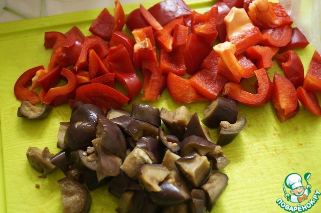 Баклажан и болгарский перец промыть, очистить перец от семян и нарезать крупными кусками.