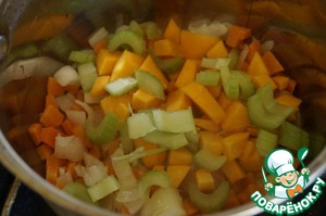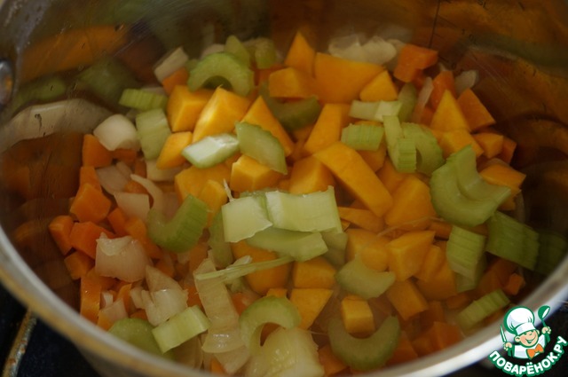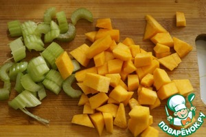 Сельдерей порезать небольшими кусочками, тыкву очистить и нарезать кубиком.