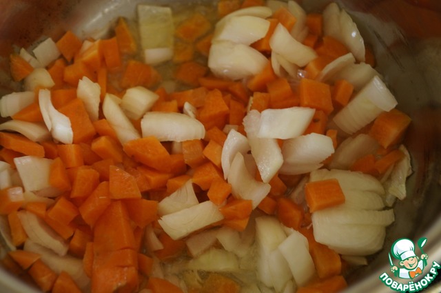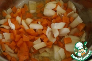 В глубокой сковороде или кастрюле с толстым дном разогреть подсолнечное масло и обжарить лук и морковь около 5 минут.