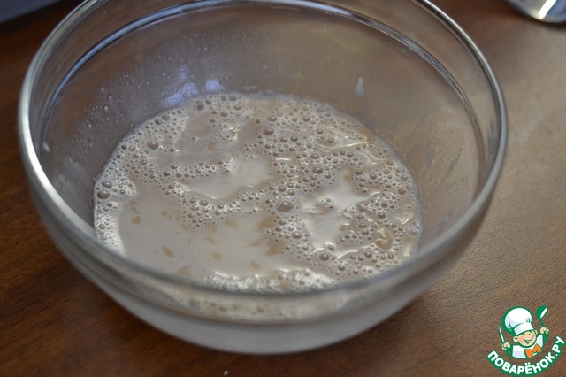 В 50мл. теплого молока развести дрожжи и 1ст. ложку сахара.