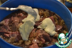 Имбирь натереть на мелкой терке, добавить к мясу.