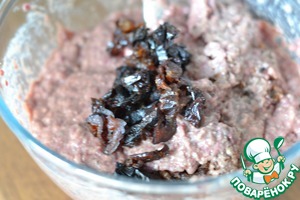 В одну добавить чернослив. Часть чернослива я помолола на мясорубке, а другую мелко нарезала на кусочки -