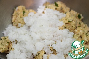 Муку смешать с разрыхлителем. Добавить к яичной смеси. Добавить сыры, замесить тесто, добавить рис, тщательно перемешать.