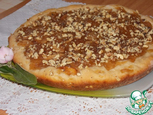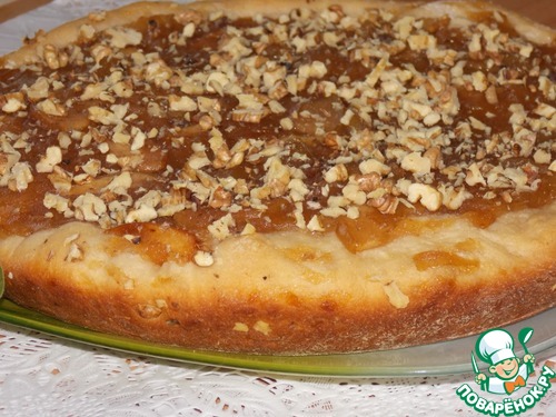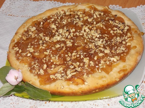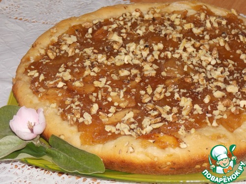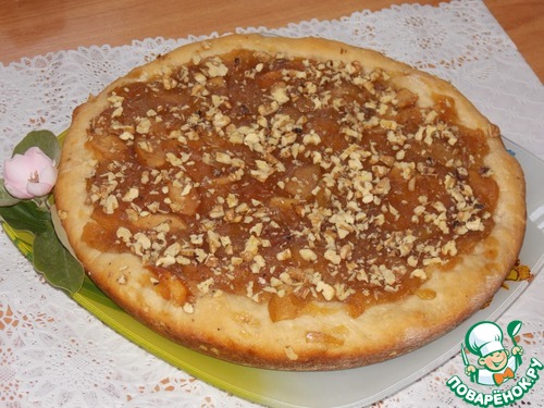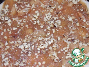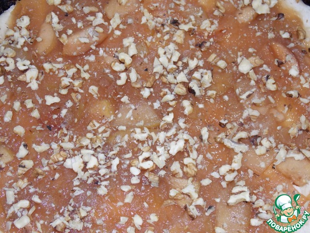 Сверху выложить варенье (у меня из груши) и посыпать орешками.