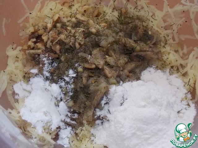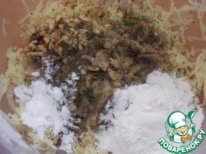 Добавить укроп, соль и перец по вкусу. Всыпать крахмал и муку. Перемешать.