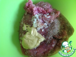Накрутить фарш на мелкой решетке. Добавить горчицу, соль, специи и чеснок пропущенный через пресс. Фарш хорошо вымесить.