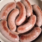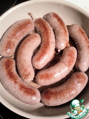 Размер колбасок определяйте сами, перекручивая порционно колбаски нужного вам размера. Иголкой сделать несколько проколов в каждой колбаске. Дальше вы можете отварить колбаски пару минут в кипящей воде, а затем запечь их в духовке. Или как я сразу обжарить на сковороде в небольшом количестве растительного масла.