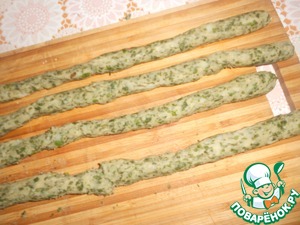 К картофельной массе добавить муку, нарезанную сныть, чесночный порошок, муку, перемешать. Получится картофельно-зеленая масса.