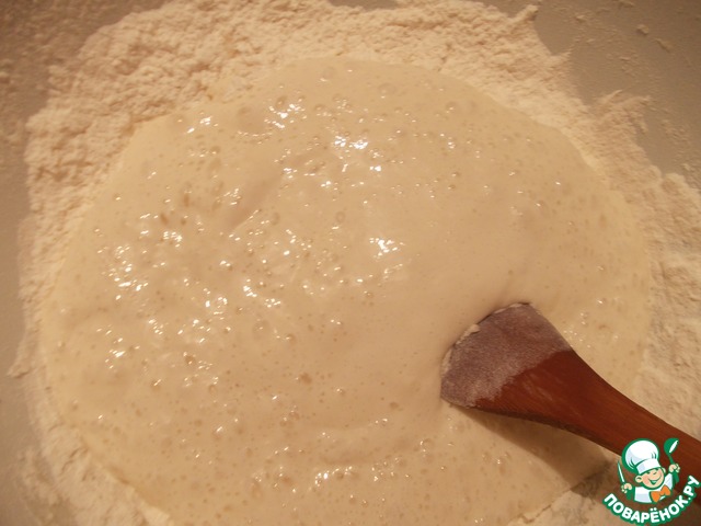 Просеиваем муку с сахаром и солью, смешиваем с опарой и теплой водой. Замешиваем тесто деревянной ложкой.
