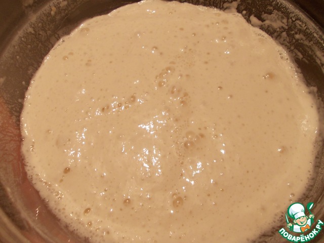 Вот такая опара изначально. Мы ее накрываем пленкой и оставляем в теплом месте на 3 часа.