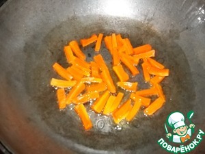 Зубчик чеснока раздавить ручкой ножа. Поставить вок (или большую сковороду с высокими покатыми стенками) на огонь, который все время поддерживать довольно сильный. Добавить масло, раскатав его по стенкам, и чеснок. Как только чеснок начал поджариваться, его нужно удалить, он уже отдал свой аромат маслу. Добавить морковь (начинать готовить стир-фрай всегда с более грубых и жестких продуктов). Жарить постоянно помешивая деревянной лопаткой (силиконовая может плавиться) 1 минуту.