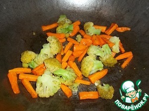 Добавить брокколи, не переставая мешать, готовить еще минуту.