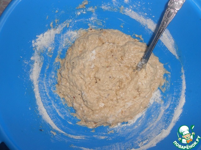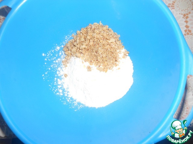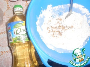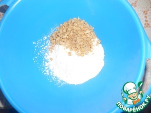 Смешать сухие компоненты :муку, разрыхлитель, мюсли, разрыхлитель, сахар.