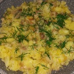 Нарезав весь картофель, перемешиваем его со шварками и накрываем крышкой. Тушим под крышкой около 5 минут. Конечно, картофель будет менее хрустящим, зато не останется сырым. Открываем крышку и протыкаем пару кусочкой картошки, проверяя готовность.