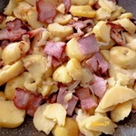 Сдвинуть шкварки к краю сковороды и выложить нарезанную картошку. Я нарезаю картофель непосредственно в сковородку. Нарезав слой сдвигаю его в сторону и режу следующий на свободную поверхность сковороды. Процесс быстрый и ответственный, поэтому фото нет.