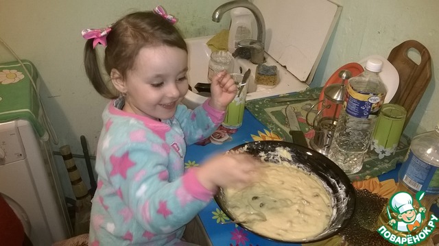 • В миску высыпаем (выливаем) сметану, к ней добавляем 2 яйца, 1 стакан сахара, ванильный сахар - перемешиваем. Потихоньку начинаем вводить 2 стакана муки. Потом добавляем 1 ч. л. гашеной соды, тщательно вымешиваем. Комочков обычно в тесте не образуется. Добавляем вкусняшки: на этот раз у меня это был изюм (предварительно распаренный кипятком). У меня сегодня была помощница в гостях, активно перемешивала тесто, еще и на вкус успела попробовать - а то мало ли что я туда намешала:)