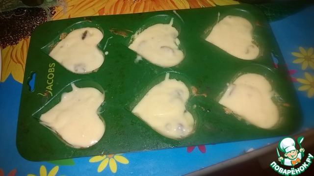 • Разливаем по формочкам. Имеем в виду, что тесто поднимается, поэтому заполняем на 2/3 (у меня по 1,5 ст. л. теста в одну ячейку). И отправляем в духовку, предварительно разогретую до 180 градусов на 15-20 мин.