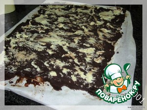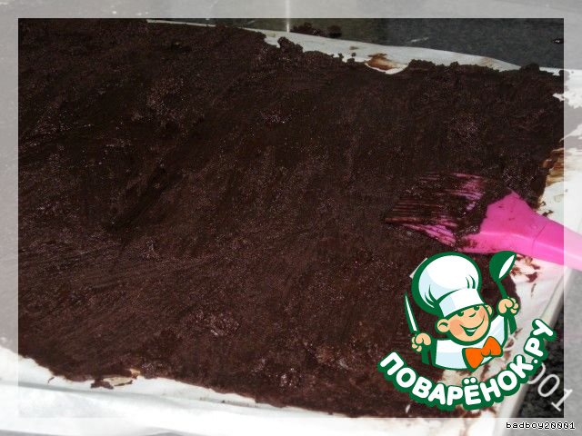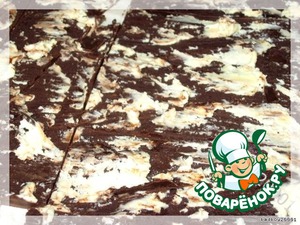 Застелить стол большим листом пергаментной бумаги. Вылить на него примерно половину горького шоколада, распределить массу по листу слоем, примерно в 3 мм толщиной, поставить в холодильник на 25 минут, затем кулинарной кисточкой промазать пласт оставшимся шоколадом и отправить на холод еще на 10 минут.