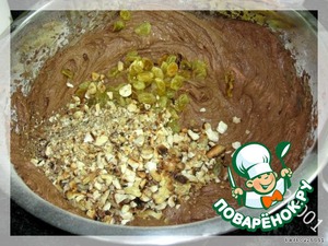 Добавьте в шоколадную смесь, просеянную муку, орехи, и изюм с вишней. Тщательно перемешайте.